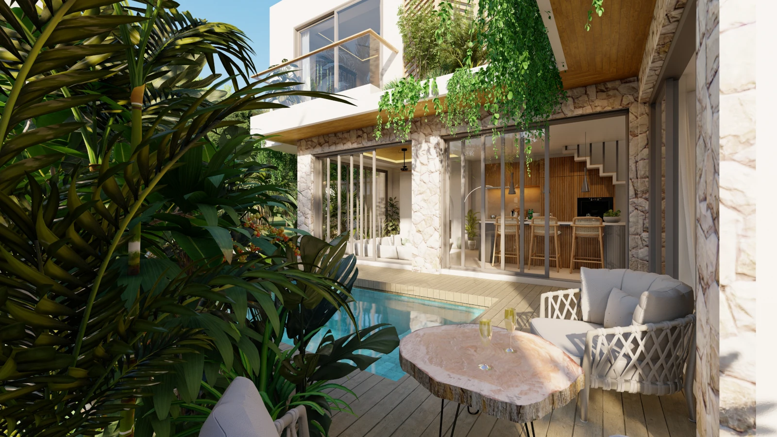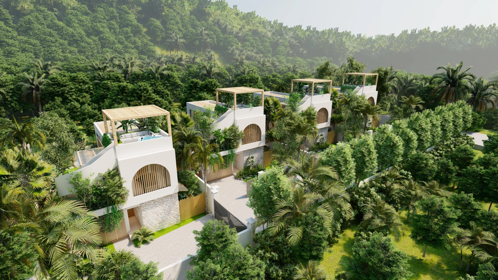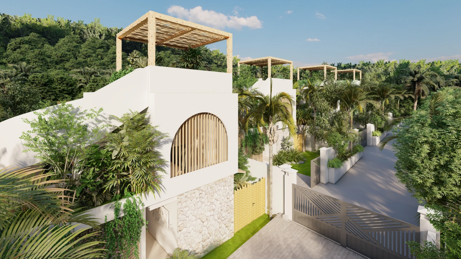 Modern architecture with private pools, lush gardens, and rooftop sea views.