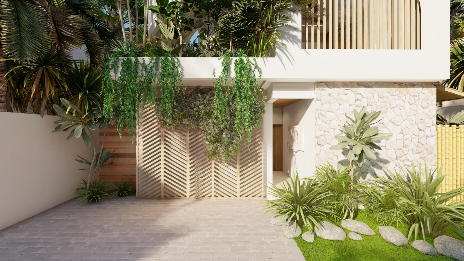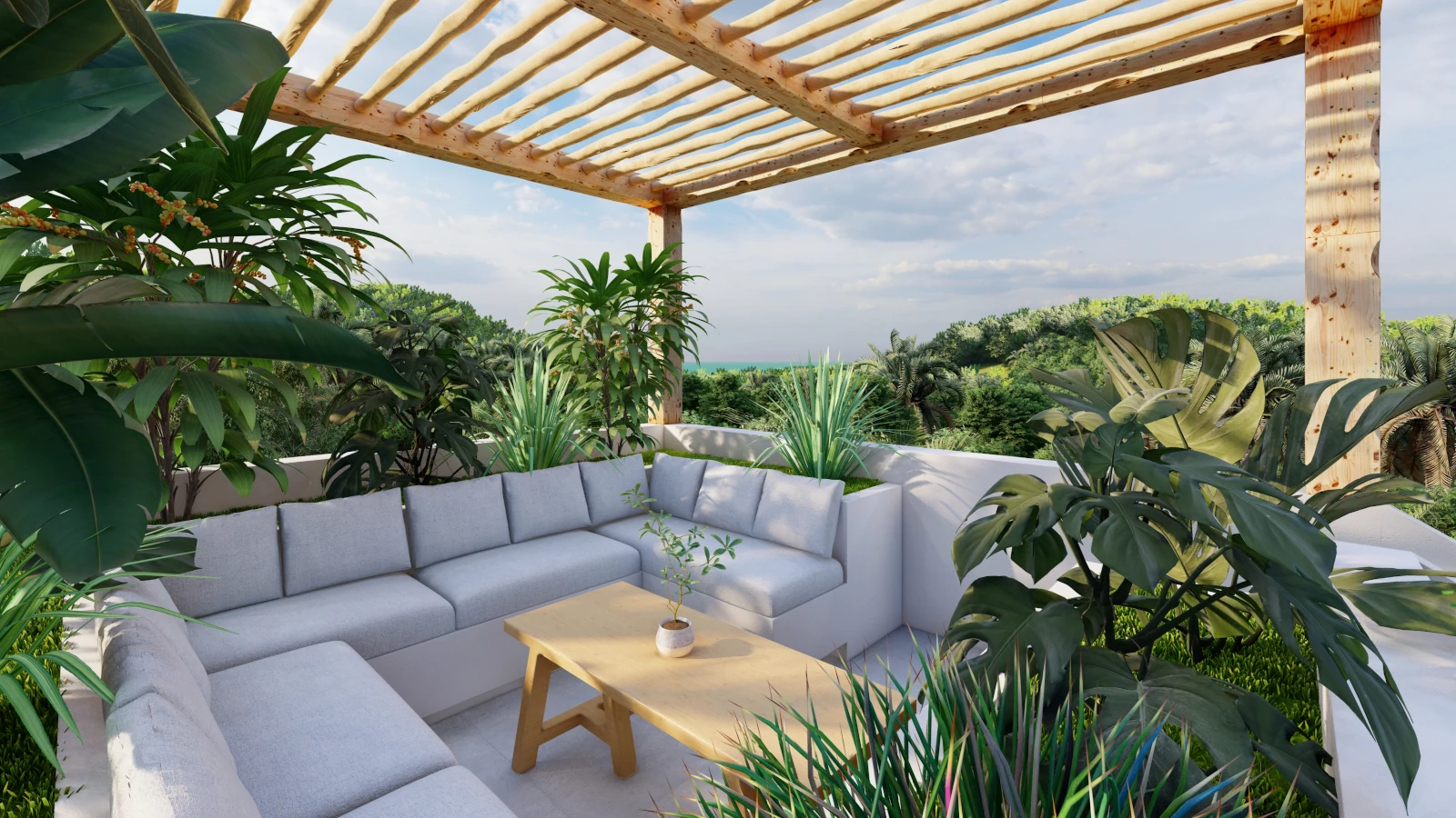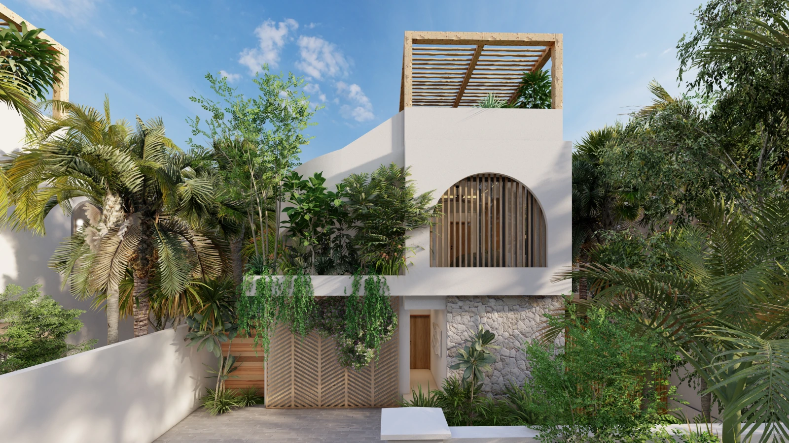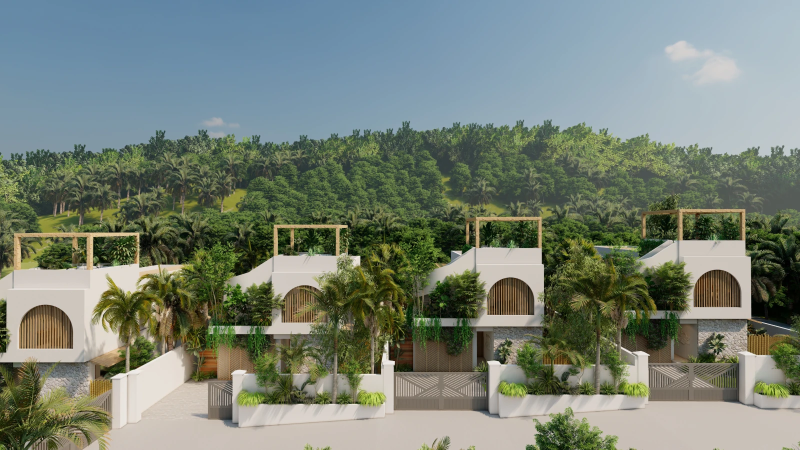 Modern architecture with private pools, lush gardens, and rooftop sea views.